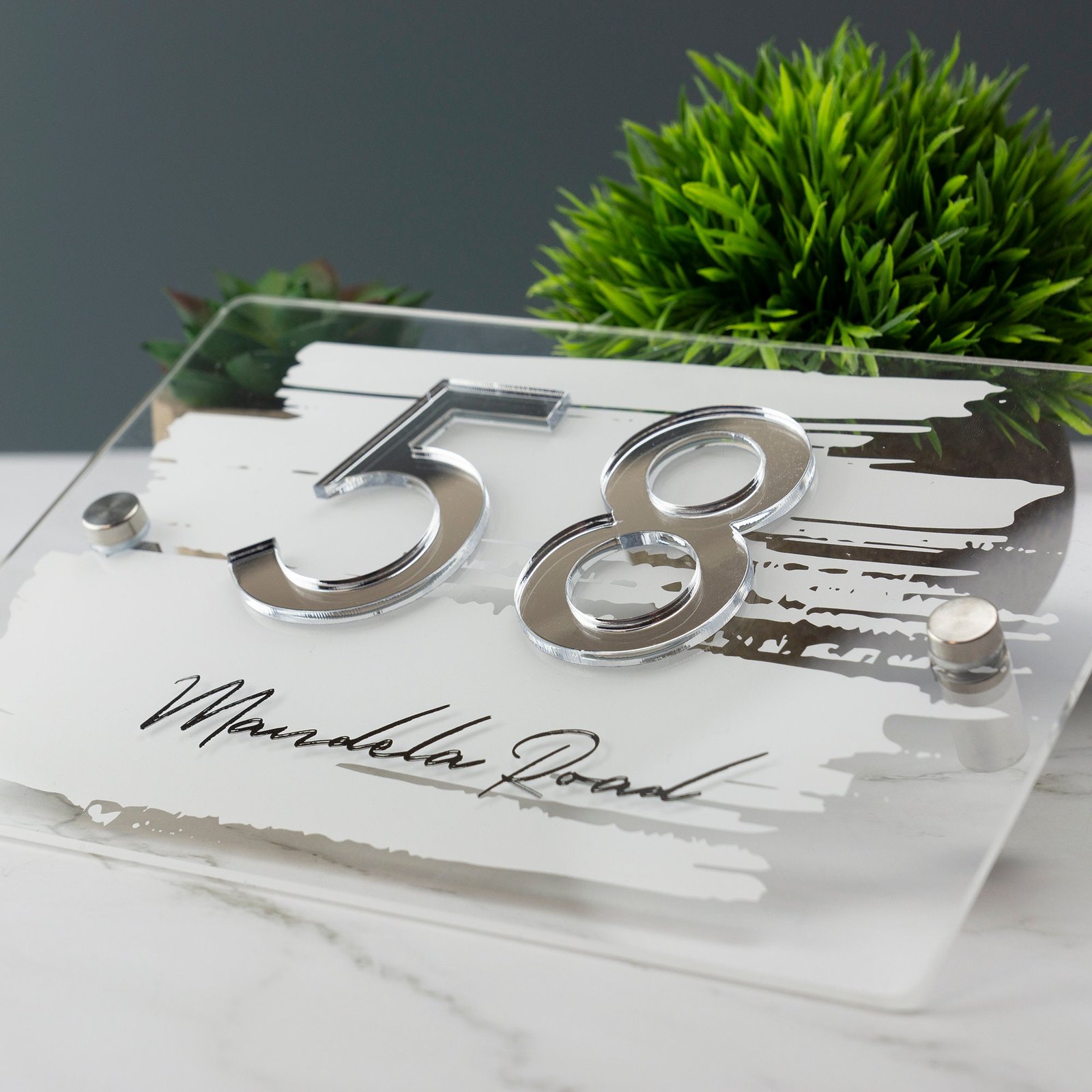 - Sleek Modern Design: The combination of a printed background with 3D mirror acrylic numbers offers a striking visual contrast that enhances any property’s appearance.